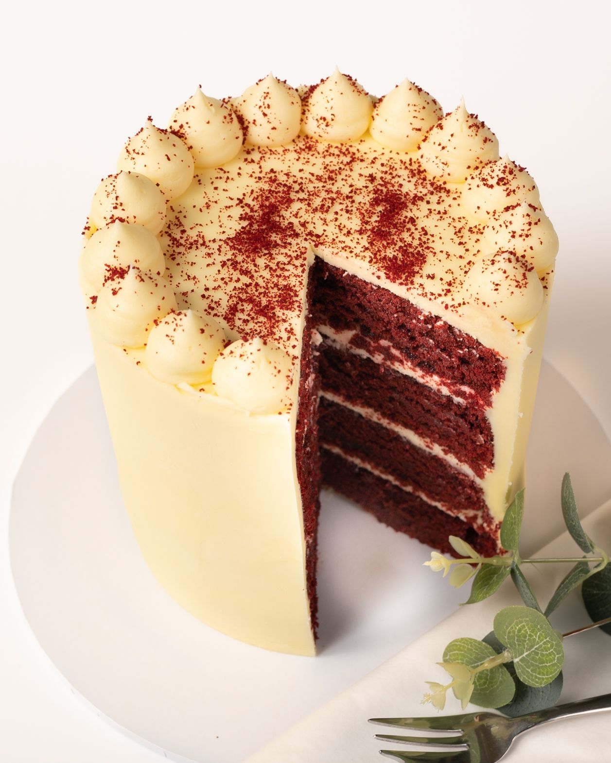 Wonderfully moist in texture and rich in flavour, the Red Velvet Cake has light chocolate and vanilla flavours. It is filled with our velvety Cream Cheese Frosting, and covered in Vanilla buttercream icing. Always popular. Always delicious.